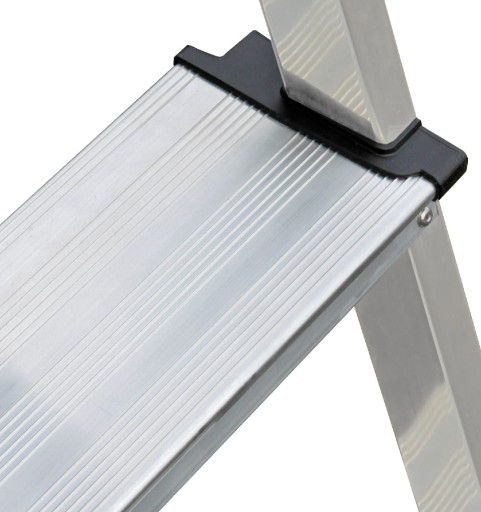 Komfortowa i lekka aluminiowa drabina wolnostojąca z wysokim pałąkiem zintegrowanym z ergonomiczną półką na narzędzia.
