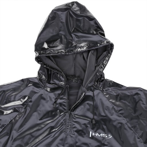 DDSS12 HMS to sauna dres. Świetne rozwiązanie, zwłaszcza dla zawodników sportów walki. Sprawdzi się, w trakcie przygotowań, kiedy zawodnik chce w szybkim czasie zmniejszyć ciężar swojego ciała. Trenując w dresie powodujemy, że znacznie szybciej wzrasta temperatura ciała. Skutkiem tego, dużo bardziej się pocimy, więc wytrącamy wodę z organizmu. Jest to sposób, na końcowe osiągnięcie pożądanej wagi i w bardzo szybkim tempie, zrzucenie 2-3 kilogramów. Sprawdzi się również, jako utrudnienie treningu. Zwiększenie temperatury podczas treningu sprawia, że organizm więcej energii, poświęca na schłodzenie ciała, tym samym ćwiczenia stają się, dużo bardziej wyczerpujące. Dres składa się z dwóch części, spodni i bluzy z kapturem. Materiał jest wygodny, wytrzymały, nie blokujący ruchów i nieprzepuszczający powietrza. Dzięki ściągaczom na nadgarstkach, w pasie i na kostkach oraz dzięki zamkowi w bluzie, maksymalnie blokujemy dopływ powietrza do ciała. DSS12 sprawdzi się w każdej dyscyplinie sportu, niezależnie czy będzie to wysiłek wydolnościowy czy siłowy.
