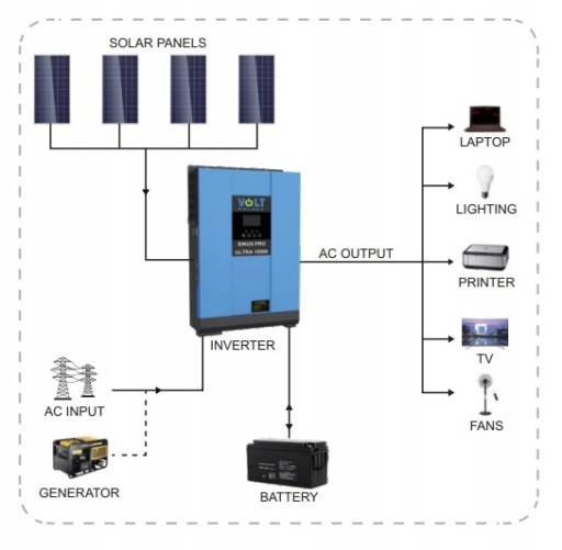 Gotowy zestaw fotowoltaiczny oparty na Przetwornicy solarnej VOLT POLSKA SINUS PRO ULTRA 6000 z wbudowanym regulatorem ładowania MPPT 60A wraz z 4x PANELEM SŁONECZNYM AKCOME 380W , akumulatorami 2 X 100Ah, przewodami oraz końcówkami do podłączenia, tworzą jedyny w swoim rodzaju