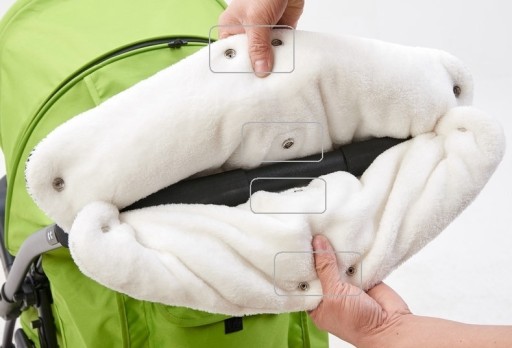 Mufkę wystarczy zapiąć na ramie wózka za pomocą metalowych zatrzasków. Taki układ zapewnia Ci swobodę wkładania i wyciągania dłoni. Dzięki temu dłonie przez cały czas masz wolne i w sekundę możesz podać dziecku ulubioną zabawkę, jeśli tego będzie potrzebowało.