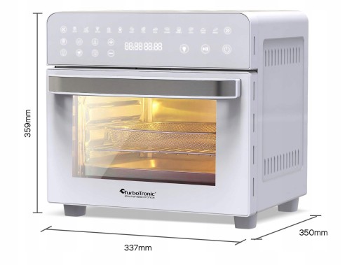 Niesamowicie wszechstronne urządzenie kuchenne! Nasz mini piekarnik o pojemności 14L to urządzenie, które oferuje wiele funkcji, takich jak rożen, dehydrator i frytownicę beztłuszczową.