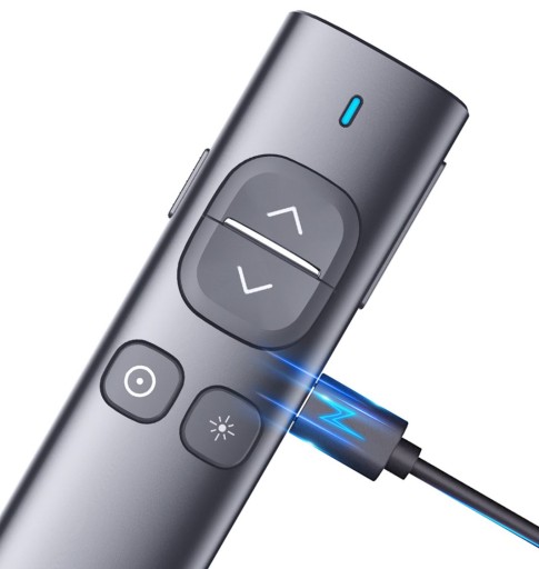 Wewnątrz ultralekkiego pilota Norwii N96s ukryto akumulator litowo-polimerowy o pojemności 300 mAh. Z łatwością naładujesz go, korzystając z popularnego portu USB-C. Gdy urządzenie będzie już na granicy wyczerpania, specjalna dioda LED zacznie mrugać na czerwono. To dodatkowe udogodnienie pozwoli uniknąć sytuacji, w których na kilka minut przed prezentacją okazuje się, że pilot nie jest gotowy do pracy.