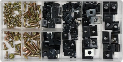 Zestaw 170 sztuk wkrętów i podkładek do karoserii. Zestaw zawiera rozmiary wkrętów i podkładek od M3x8 mm do M6x20 mm. Całość umieszczono w wygodnym opakowaniu typu "sortownik".