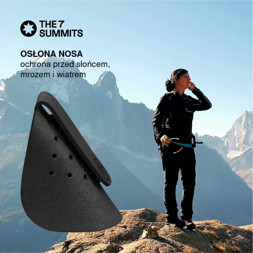 Osłona nosa THE 7 SUMMITS jest produktem przeznaczonym do wielokrotnego użycia z okularami. Dostępna jest w jednym, uniwersalnym rozmiarze i pasuje do większości typów okularów. Aby zamontować osłonę, należy owinąć wbudowany pasek wokół mostka okularów i zabezpieczyć zapięciem na rzep. Długość paska dostosowana jest do okularów o standardowej grubości mostka. Zakres pokrycia nosa regulowany jest sposobem zapięcia rzepa.