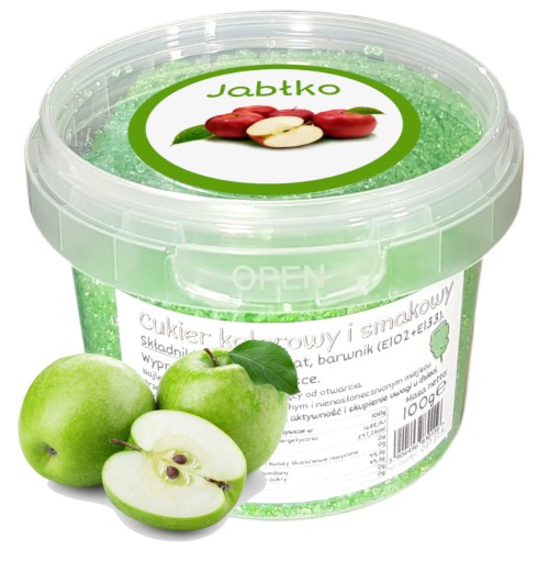 Pragniemy przedstawić naszą ofertę - kolorowy cukier 100g w wiaderku, zielony o smaku i zapachu jabłka.