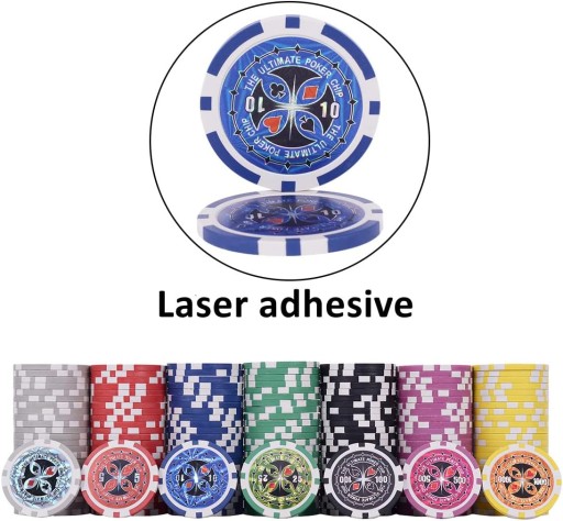 Ten zestaw żetonów do pokera zawiera 300 kolorowych żetonów laserowych (100 żetonów szarych, 50 żetonów czerwonych, 50 żetonów niebieskich, 25 żetonów zielonych 25 żetonów czarnych, 25 żetonów fioletowych, 25 żetonów żółtych). A k