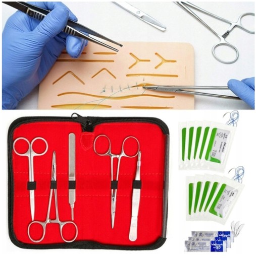 Suture Practice Kit Suturing Human Skin Medic al Silicone Training Pad Tool Kits Feature: Condition: 100% Brand NewComplete Suture Practice Kit for Suture Training.Easy to carry and can be used to practice everywhere.5 piece stainless steel instrument set is exactly what the trainer (read, med student / resident on a rotation / vet student / bio-lab student) ordered.Perfect for practicing suture techniques and or for lab dissections.Stainless steel ensures longevity while the quality speaks for itself.A neat little bundle wrapped up in a case which fits perfectly in your lab coat.This Suture Practice Kit is intended for training demonstrational, educational purposed and Student Dissecting training only.It's non-sterile and are not intended for personal care, use on patients or animals. Package includes 1 PU suture bag 5 sets of tools 5 suture needles with thread 5 blades