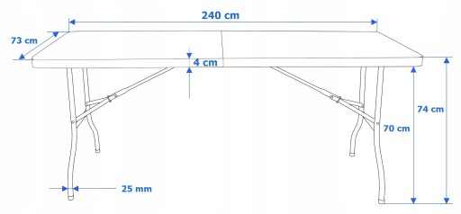 Składany stół kempingowy/cateringowy. Bardzo praktyczny i lekki. Konstrukcja wykonana ze stali. Blat wykonany z mocnego tworzywa sztucznego. Stolik po złożeniu tworzy praktyczną walizkę, dzięki czemu zajmuje małą przestrzeń i jest łatwy do przeniesienia. Przy stole może usiąść nawet do 12 osób.