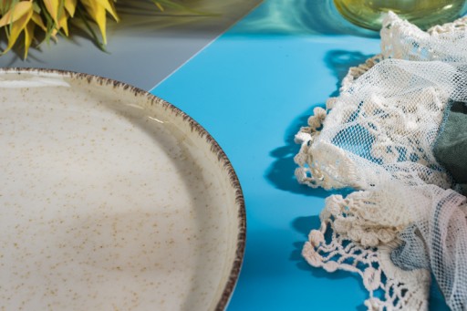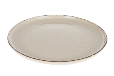 Talerz płytki, wykonany z porcelany. Praktyczny i stylowy, w beżowo-brązowej kolorystyce z nakrapianym wzorem i zdobionym rantem. Idealny do serwowania dań obiadowych.