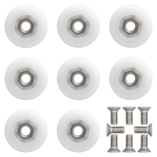 Kółka do prysznica 25 mm wykonane z odpornego na uszkodzenia tworzywa stanowią zestaw naprawczy rolek do kabin prysznicowych. W zestawie ośmiu kółek do kabiny prysznicowej znajdują się dodatkowo śruby montażowe dające możliwość szybkiej wymiany zużytych elementów na nowe. Zastosowanie łożysk kulkowych ze stali nierdzewnej zapewniają ciche, płynne, a także bezawaryjne działanie. Obudowa zewnętrzna łożyska wykonana z tworzywa wydłuża czas eksploatacji części. Osiem sztuk kółek wraz ze śrubami montażowymi stanowi zestaw naprawczy rolek pasujący do kabin prysznicowych marki IMPERIAL, Kabi, Mexen i wielu innych.
