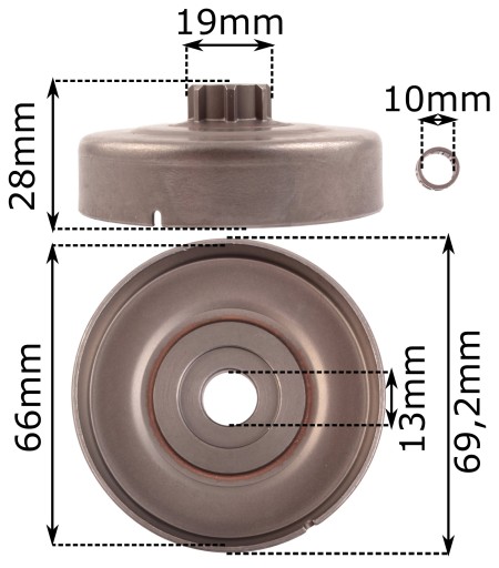 Wymiary: 69.2x66x28(średnica zewn. x wewn. x wys. całkowita), średnica otworu: 13 mm