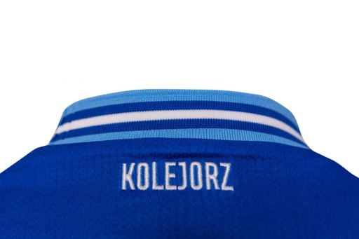 Koszulkę meczową zaprojektował Michał Leosz, który trykotowi starał się nadać lekki styl retro, ale z ukośnymi liniami dodającymi dynamizmu i tworzącemu dzięki temu nowoczesną całość. Dodatkowo w każdym komplecie kołnierzyk oraz ściągacze rękawków są trójkolorowe (niebiesko-biało-błękitne), co tylko dopełnia całą kompozycję. Z kolei na piersi znajduje się niebiesko-biały herb w postaci obhaftowanego żakardu HD, a na karku haftowany napis KOLEJORZ.