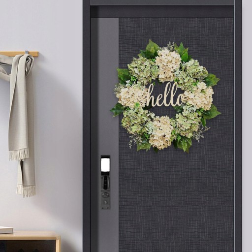 WIEŃC SEZONOWY: Ten ręcznie robiony jedwabny wianek z hortensji z tabliczką na drzwiach z literą 3D „HELLO” na powitanie gości.