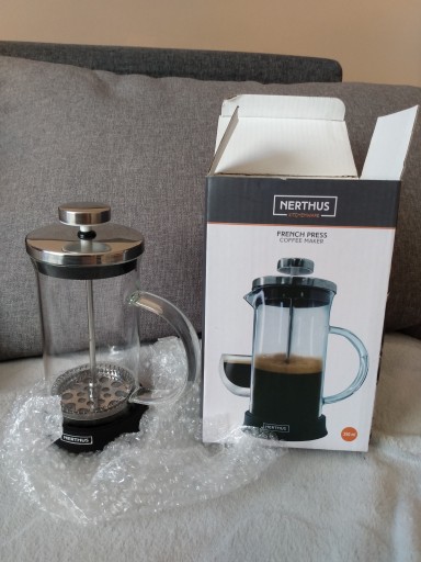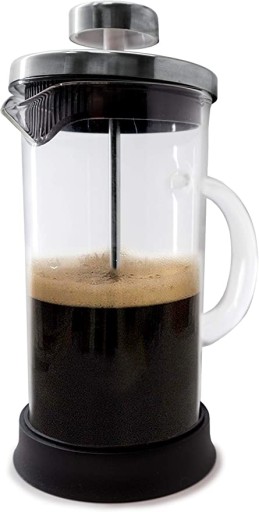 - Instrukcja obsługi: na dno nalewamy bardzo gorącą wodę wraz z mieszanką zmielonej kawy i pozostawiamy na około 4 minuty z tłokiem u góry; następnie tłok zostaje wciśnięty, a tłok opada, oddzielając wodę z roztworem kawy w górnej części i pozostawiając resztki kawy w dolnej części