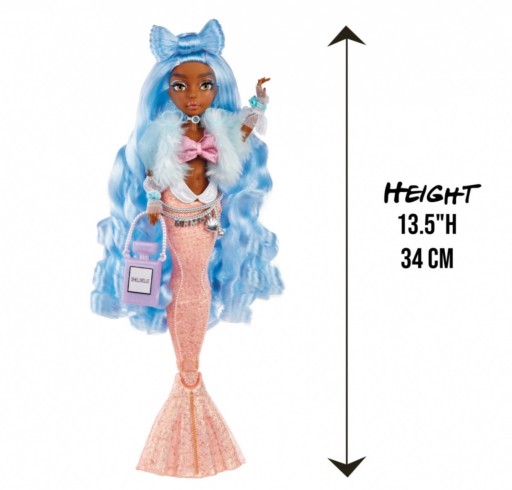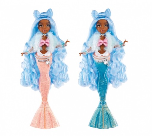 Lalka modowa Shellnelle ma realistyczny, wyrzeźbiony ogon, który po zanurzeniu w ciepłej wodzie spektakularnie zmienia kolor. Zobacz, jak jego odcień przechodzi z koralowego w turkusowy. Ogon zmienia się również w stojak, gdy zegniesz płetwę pod kątem 90 stopni. Każda syrena Mermaze Mermaidz zgina się w szyi, ramionach, łokciach, nadgarstkach, tułowiu, talii, płetwie i w kolanach, dzięki czemu możesz stworzyć wiele póz!