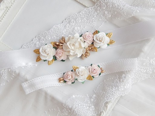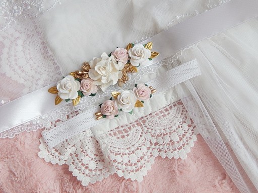 Różany pasek do sukienki wykonany z wstążki satynowej w kolorze białym o długości ok 120cm. zdobiony pięknymi kwiatami.