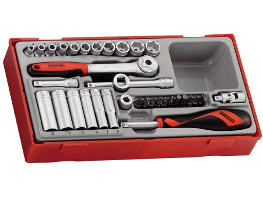 Zestaw zawiera 11 nasadek sześciokątnych krótkich i 6 długich, 11 grotów do wkrętaków, pokrętło zapadkowe, przegub uniwersalny, dwa przedłużacze, nasadkę do grotów wkrętakowych 1/4 cala, łącznik redukcyjny 3/8 cala -1/4 cala oraz rękojeść wkrętaka z końcówką 1/4 cala. Dostarczany w pojemniku plastikowym z odłączaną pokrywą. Pasuje do skrzynek i wózków narzędziowych TengTools.