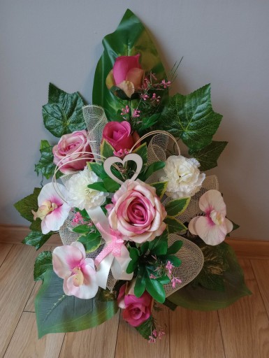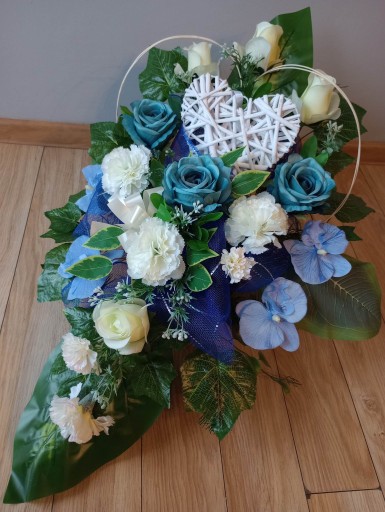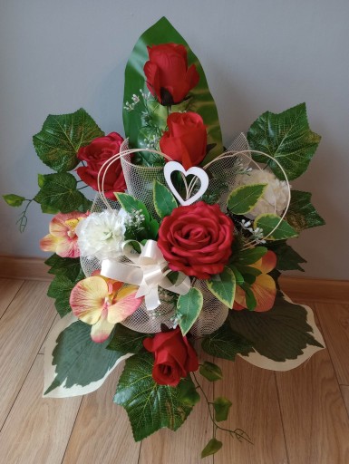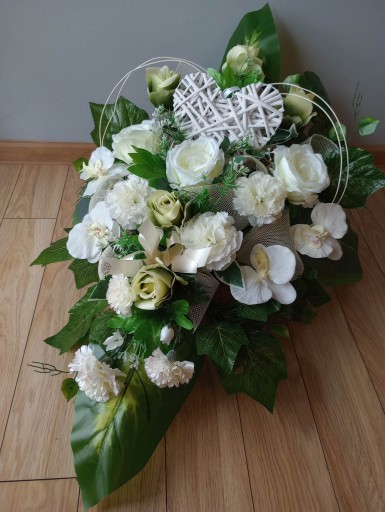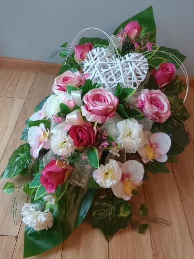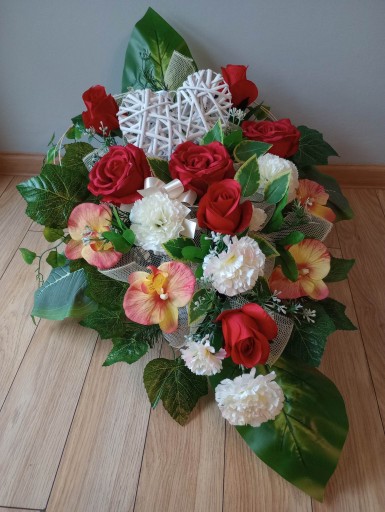 - PIERWSZA Kompozycja sztuczna DUŻA (tzw. stroik, ikebana) Z SERCEM WIKLINOWYM ma ok. 80 cm długości i 50 cm szerokości