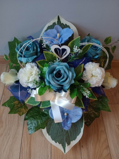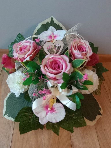 Przepiękny KOMPLET TRZYCZĘŚCIOWY na grób ze sztucznych kwiatów, DWIE kompozycja na płytę z możliwością wybrania jednej dedykacji dla babci/dziadka/mamy/taty (wszystkie dostępne opcje są widoczne na ostatnim zdjęciu) oraz jeden bukiet do wazonu na flakonie uniwersalnym. Nasze kompozycje wykonujemy własnoręcznie ze starannością, dzięki czemu stroiki są niepowtarzalne, a na żywo prezentują się jeszcze piękniej :)