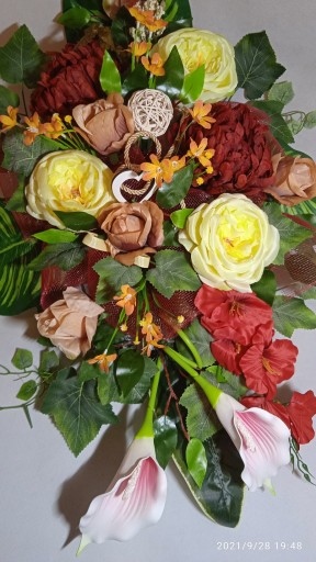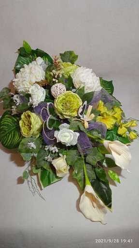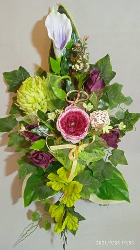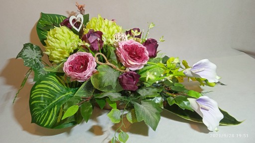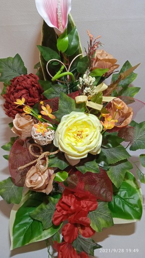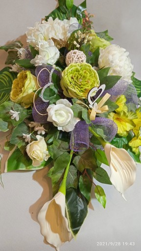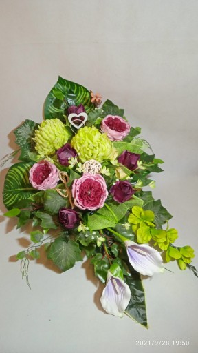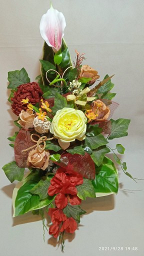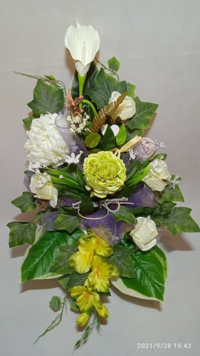- Kompozycja sztuczna (tzw. stroik, ikebana) do postawienia na płycie grobu jest wykonana w doniczce plastikowej, ma ok. 80 cm długości i 50 cm szerokości.