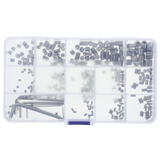 Ten zestaw śrub ustalających zawiera różne elementy metrycznych śrub ustalających z gniazdem sześciokątnym, idealne do różnych potrzeb.