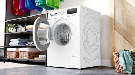 Pralka ładowana od frontu o szerokości 60cm, pojemności 7 kg z możliwością dołożenia prania.