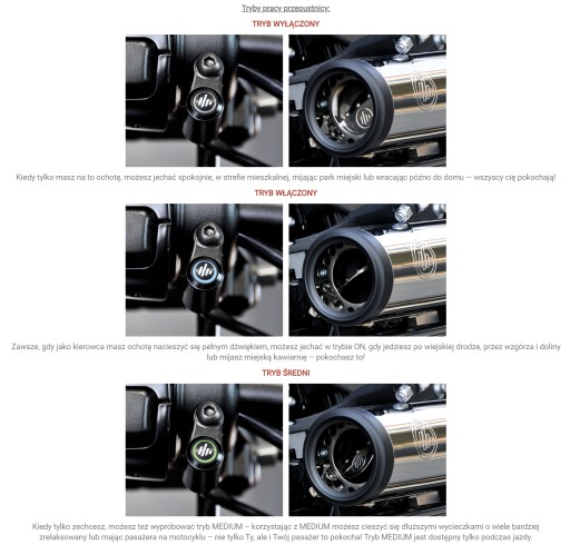 Podczas korzystania z naszych elektronicznych systemów dźwiękowych można przełączać się między różnymi trybami dźwięku. W każdym trybie, w tym w trybie pełnej głośności w trybie ON, ale także w trybie MEDIUM i OFF, spełnione są wszystkie wymogi prawne dotyczące wydajności, emisji spalin i emisji dźwięku. W trybie OFF jest jeszcze ciszej niż w oryginalnym układzie wydechowym. Dzięki temu możesz czerpać prawdziwą przyjemność z jazdy i jednocześnie dbać o środowisko.