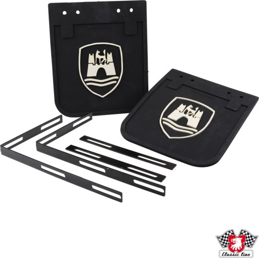 VW Transporter T1/T2 Komplet chlapaczy ze wspornikami, czarny z białym logo Wolfsburga