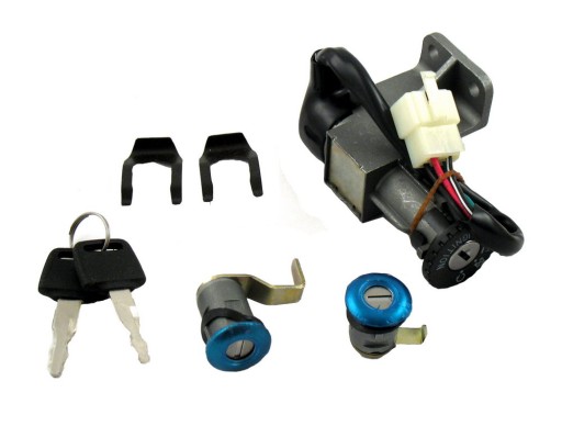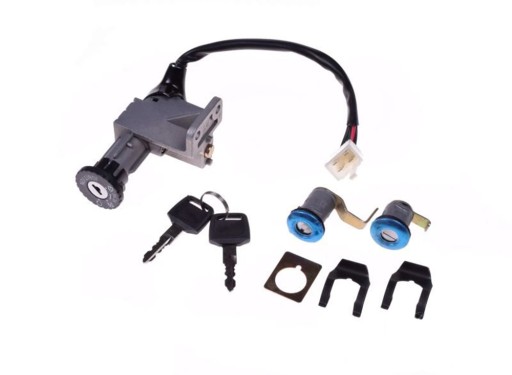 Stacyjka do popularnych skuterów, z charakterystycznym wlewem paliwa. Przewód zakończony wtyczką na 4 piny. W komplecie: 2 kluczyki, stacyjka z blokadą kierownicy, zamek klapki wlewu oleju oraz zamek schowka pod siedzeniem.