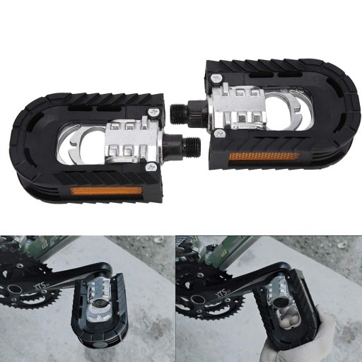 Składane pedały, wysokiej jakości twarde tworzywa sztuczne, środkowa srebrna część wykonana jest ze stopu aluminium, rdzeń wału wykonany ze stali węglowej, a przednia część pedału jest antypoślizgowa, aby zwiększyć tarcie. Można go łatwo złożyć jedną ręką do przechowywania, można używać rowerów składanych, rowerów górskich i wyścigowych.