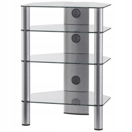 Idealny do każdego wnętrza aluminiowy stolik RTV ze szklanymi półkami na sprzęt audio-video. Blat stolika wraz z półkami został wykonany z płaskiego szkła hartowanego z polerowanymi krawędziami o bardzo dużej wytrzymałości.