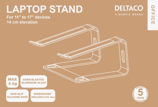 Zaufaj jakości produktu - podkładka pod laptopa DELTACO OFFICE objęta jest 5-letnią ochroną producenta. Lekka konstrukcja wykonana z aluminium zapewnia nie tylko trwałość, ale także łatwość przenoszenia podkładki między różnymi miejscami pracy. Maksymalne obciążenie wynoszące 5 kg sprawia, że podkładka nadaje się do różnych typów laptopów, zapewniając wygodę użytkowania niezależnie od modelu.