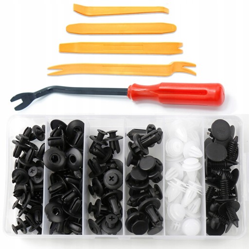 Uniwersalny zestaw 100 szt różnych spinek, kołków, zatrzasków samochodowych do mocowania tapicerki w samochodzie, błotników, zderzaków, drzwi.