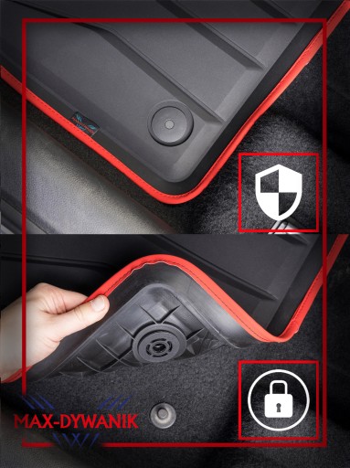 - Dopasowanie do samochodu: Mocowania są specjalnie dostosowane do marki/modelu, zapewniając idealne przyleganie dywanika do podłogi.