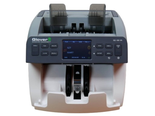 Liczarka Glover GC-180 VN to profesjonalna liczarka wartościowa perfekcyjna w zakresie przeliczania banknotów. Liczarka Glover GC-180 VN zapewnia możliwość wielostronnego sprawdzania autentyczności znaków pieniężnych na banknotach dzięki modułom CIS, IR, UV, MG i MT, a jednocześnie wyróżnia się kompaktową konstrukcją, co znacznie ułatwia organizację stanowiska kasjera. Liczarka Glover GC-180 VN przeznaczona jest do przeliczania oraz kontroli banknotów w jednej z osiemnastu obsługiwanych walut (PLN, EUR, USD, GBP, CHF, AUD, RUB, CAD, DKK, NOK, SEK, HUF, CZK, BGN, RON, HRK, TRY, JPY). Wykorzystanie kolorowego ekranu dotykowego, przyjaznego interfejsu w języku polskim oraz czytelnych i uniwersalnych symboli sprawiają, że komunikacja z liczarką do banknotów Glover GC-180 VN jest wyjątkowo prosta i intuicyjna.