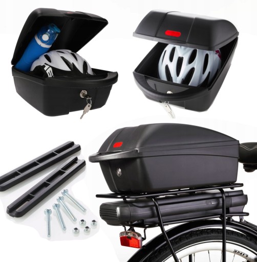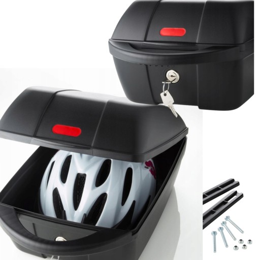 Kuferek plastikowy na rowerowy bagażnik, łatwy montaż, pasuje do wszystkich popularnych bagażników, zamykany na zamek, odporny na uderzenia, polipropylen odporny na warunki atmosferyczne, załączona szczegółowa instrukcja montażu, w komplecie wszystkie elementy montażowe.