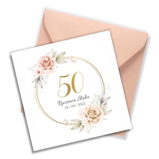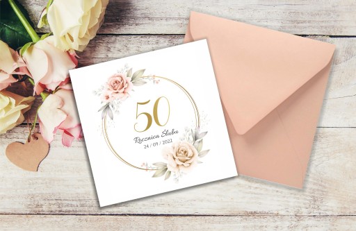 Zaproszenie na Rocznicę Ślubu z delikatną, kwiatową grafiką, wykonane na satynowym papierze o wysokiej gramaturze. Zaproszenie jest w pełni personalizowane. Dodatkowo do zaproszenia dołączona jest koperta.