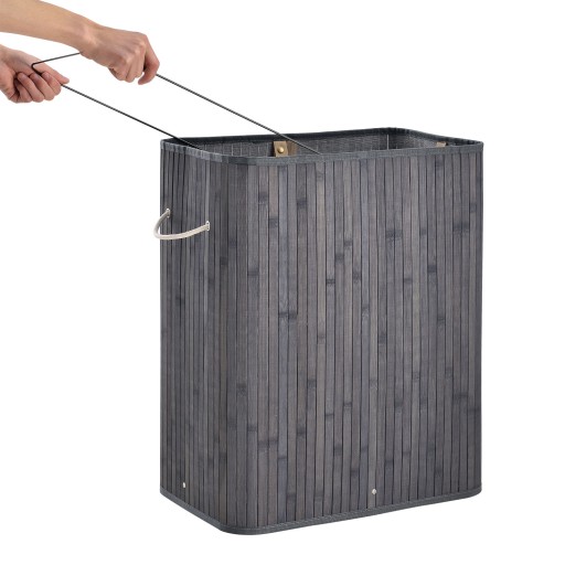 Separator bielizny składa się z bambusowego korpusu, metalowej ramy i drewnianej podstawy. Zapewnia to solidną stabilność. Ponadto kosz na ubrania ma dwa solidne uchwyty linowe. Dzięki temu napełniony pojemnik na pranie jest łatwy i elastyczny do przenoszenia do pralki.