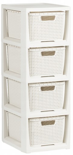 Czteroczęściowy regał Rattan jest bardzo dobrym rozwiązaniem do przechowywania w małych przestrzeniach. Wykonany bardzo estetycznie, z wysokiej jakości, bezpiecznego materiału (wolnego od ftalanów i bpa) jest idealny do takich pomieszczeń jak łazienka, garderoba, dziecięcy pokój czy domowe biuro. Produkt polski.