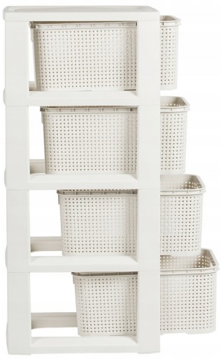 Czteroczęściowy regał Rattan jest bardzo dobrym rozwiązaniem do przechowywania w małych przestrzeniach. Wykonany bardzo estetycznie, z wysokiej jakości, bezpiecznego materiału (wolnego od ftalanów i bpa) jest idealny do takich pomieszczeń jak łazienka, garderoba, dziecięcy pokój czy domowe biuro. Produkt polski.