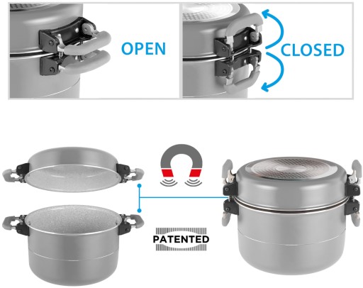 System łączenia garnków, który dzięki zastosowaniu składanych uchwytów ze zintegrowanymi elementami magnetycznymi, pozwala znacznie zmniejszyć wielkość opakowania zestawu garnków, a także sprawia, że nie jest konieczne stosowanie paska mocującego do stabilizacji zestawu podczas transportu.