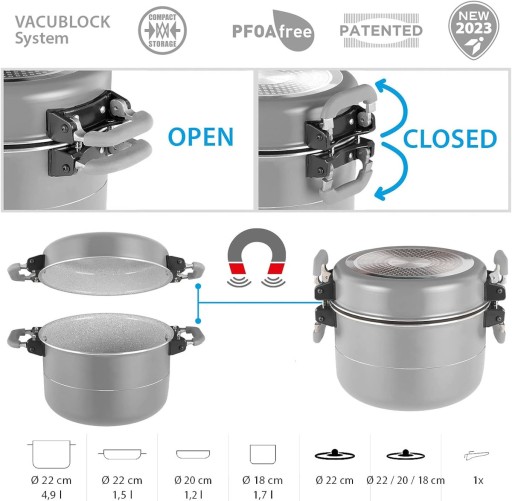 Produkt wyróżnia nowoczesny design połączony z najwyższą jakością wykonania. Spełni wymagania nawet najbardziej wymagających klientów. Innowacyjna konstrukcja sprawia iż zestaw garnków sprawdzi się idealnie w małych kuchniach w kamerach, przyczepach i jachtach. Wyjątkowo niska waga i małe gabaryty po złożeniu gwarantują oszczędność miejsca w szafkach i pozwalają na zabranie garnków w plecaku na biwak, piknik lub działkę. Garnki mogą wyć także wykorzystywane w gospodarstwie domowym.