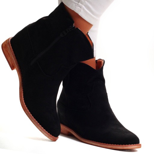 Gładkie, zamszowe, damskie zamszowe botki w kolorze czarnym. Posiadają ukryty koturn oraz delikatne ocieplenie. Idealne na jesień lub wiosnę.