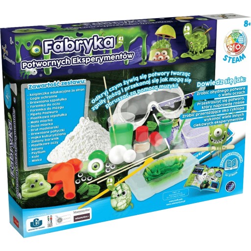 Dzięki Fabryce Potwornych Eksperymentów od Science4you dowiesz się, czym są potwory i skąd pochodzą pierwsze wzmianki o nich. Zdobądź wiedzę na temat różnorodnych mutacji, które mogą występować u ludzi. Poznaj pojęcie nauki oraz przeczytaj wiele potwornych faktów. Wykonaj mnóstwo ciekawych eksperymentów związanych z tematyką potworów: klejący potwór, oko cyklopa a może smocze jajo? Daj się zaskoczyć z zestawem naukowym od S4Y Fabryka Potwornych Eksperymentów. Do wykonania: 12 eksperymentów.