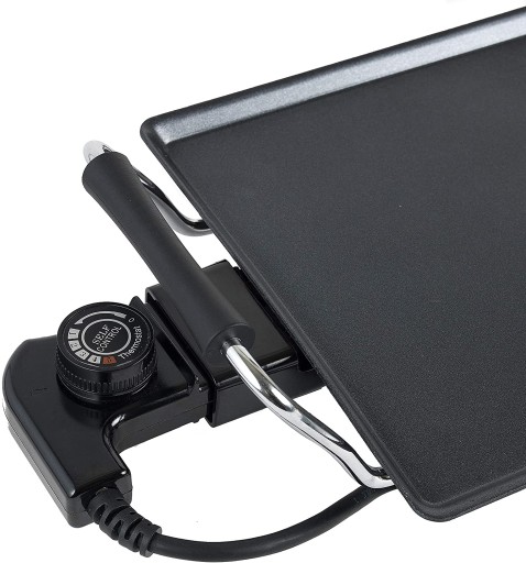 Duża płyta grillowa (47,5 x 25,5 cm) nadaje się do użytku w pomieszczeniach, na balkonie lub w ogrodzie, wysokiej jakości powierzchnia z powłoką zapobiegającą przywieraniu do grillowania mięsa, kiełbasek, warzyw, ziemniaków, jajek, naleśników i wielu innych, łatwa obsługa ze zdejmowanym regulatorem temperatury (maks. 227 °C) i lampką kontrolną, bezpieczeństwo dzięki izolowanym termicznie uchwytom i antypoślizgowym nóżkom, oszczędność miejsca, wysoka krawędź do przechowywania, łatwe czyszczenie dzięki gładkiej, nierowkowanej powierzchni i dołączonej tacy na tłuszcz