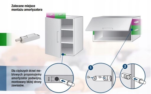 Niewielkie wymiary i tylko 8mm średnicy pozwalają na łatwy montaż amortyzatora, zarówno z użyciem opcjonalnego adaptera jak i wiercąc otwór w korpusie mebla.