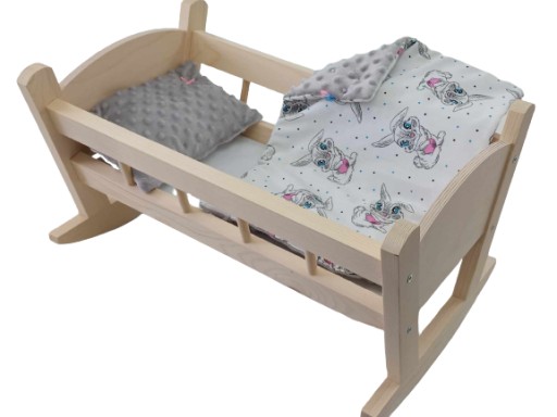 Urocza kołyska drewniana dla lalek, wykonana z drewna świerkowego.