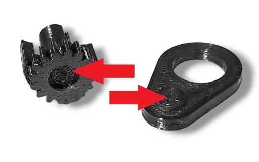 2. pod widoczną zębatką umieść element montażowy tak aby wypustka była skierowana od motoreduktora