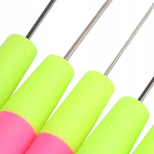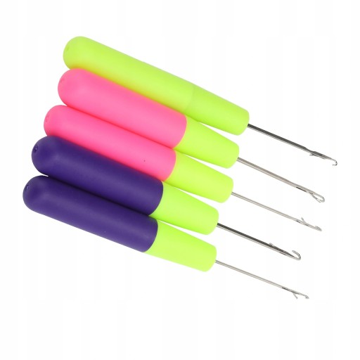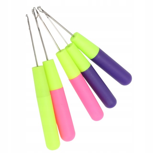 3. Zestaw szydełkowy ze swetrem zawiera 2 różowe szydełka, 2 fioletowe szydełka i 1 zielony szydełkowy.
