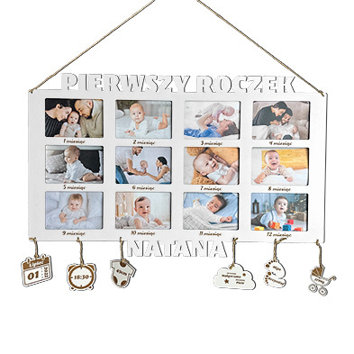 Wprowadzamy Cię w świat niezwykłej ramki na 12 zdjęć, która zachowa wspomnienia z pierwszego roku życia Twojego dziecka i stanie się piękną ozdobą każdego dziecięcego pokoju. Ten pierwszy rok to czas pełen cudów, a Twój Mały Człowiek zmienia świat wokół Ciebie. W ciągu zaledwie 12 miesięcy rośnie i rozwija się w niesamowitym tempie. Idealna pamiątka przypominająca, jak co miesiąc zmieniało się dziecko przez pierwszy rok życia.